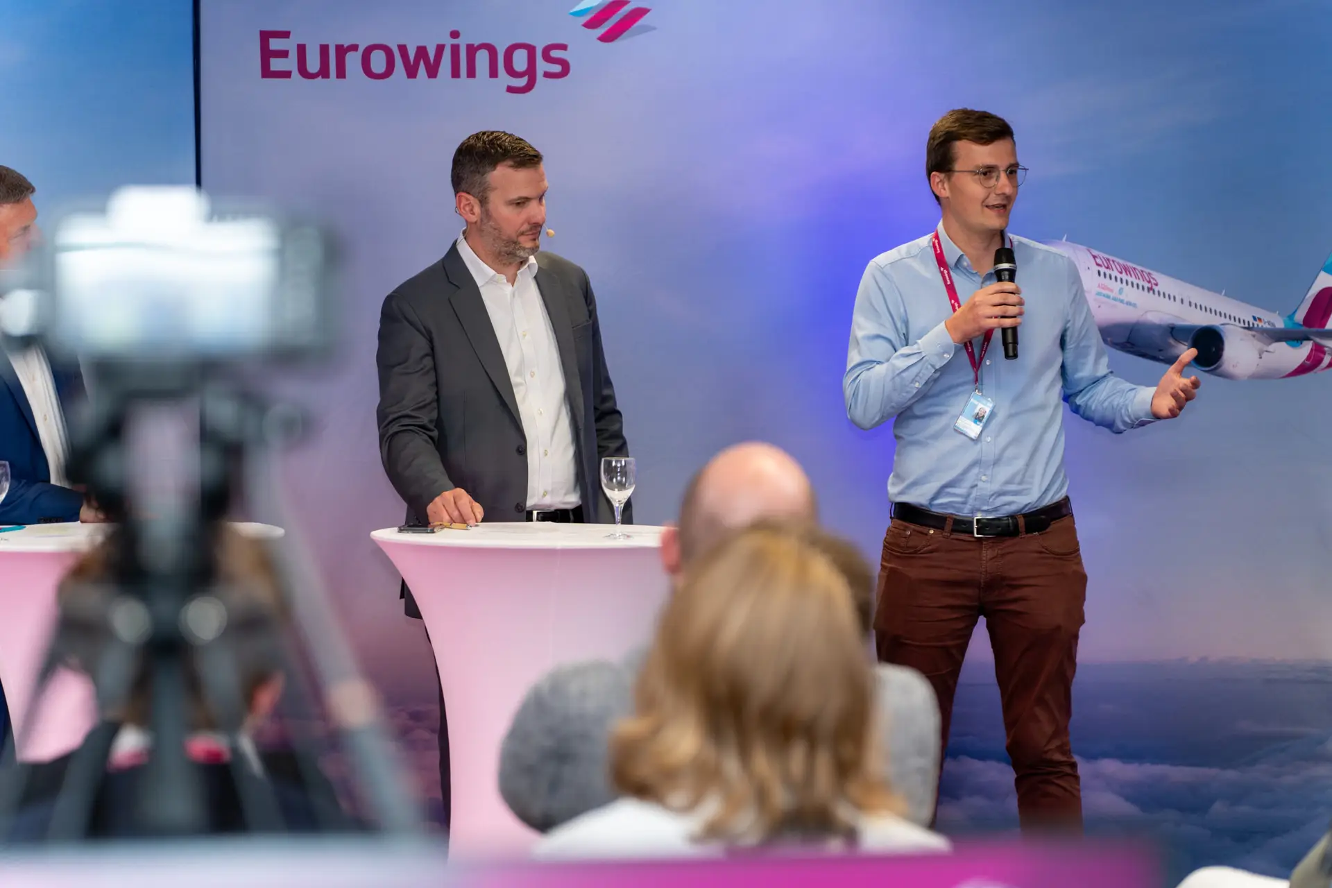 Jens Bischof (CEO & CCO) und Edi Wolfensberger (COO) präsentierten gemeinsam aktuelle Entwicklungen, Zahlen und Visionen für die Zukunft von EUROWINGS. Die beiden Führungskräfte standen im Zentrum des Townhall-Formats und adressierten direkt das gesamte Team – über 5.000 Mitarbeitende.