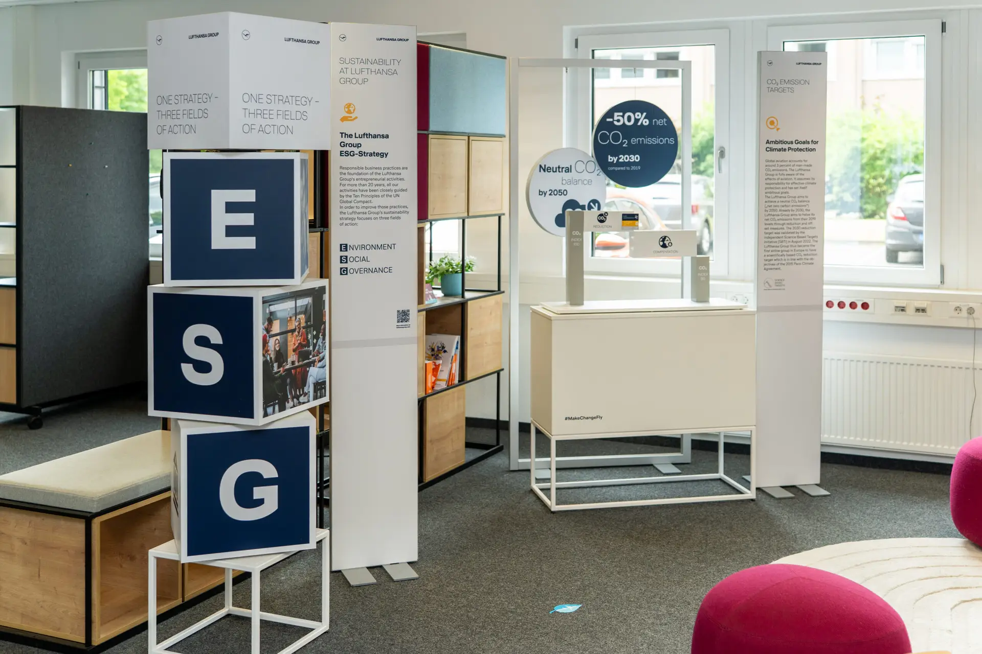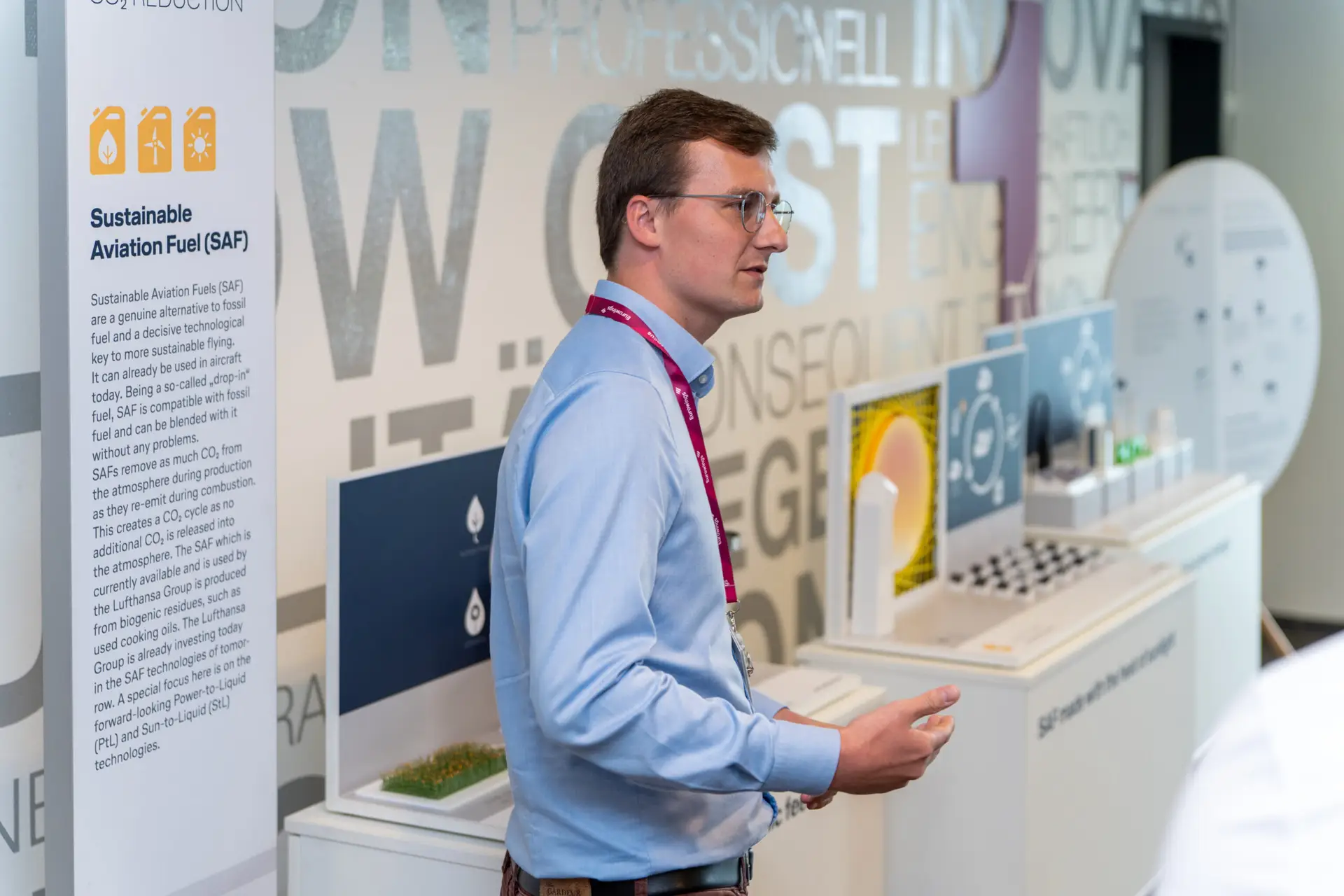 Unmittelbar nach dem Webcast eröffnete Edi Wolfensberger die ESG-Roadshow am Hauptsitz in Köln. Im Mittelpunkt standen acht interaktive Stationen, die die ESG-Strategie der Lufthansa Group erlebbar machten. Themen wie Flottenmodernisierung, der Einsatz von Sustainable Aviation Fuels (SAF) oder operative Effizienz zeigten konkrete Wege hin zum Ziel: CO₂-neutrales Fliegen bis 2050.